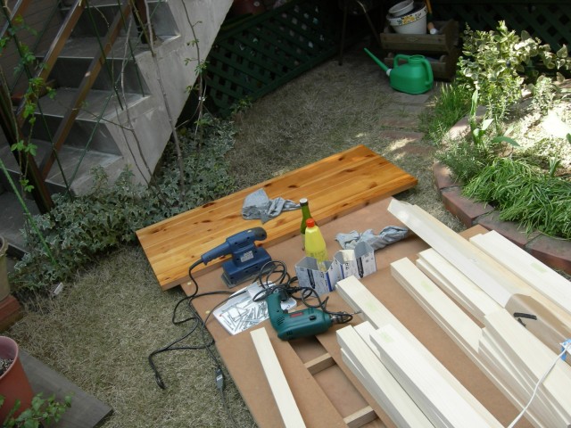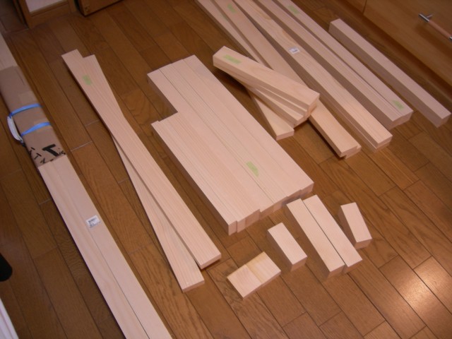 集めたのは・・・木材、コンクリートブロック。木材はアートマンで買って寸法どおりに切ってもらってあります。(←へたれw